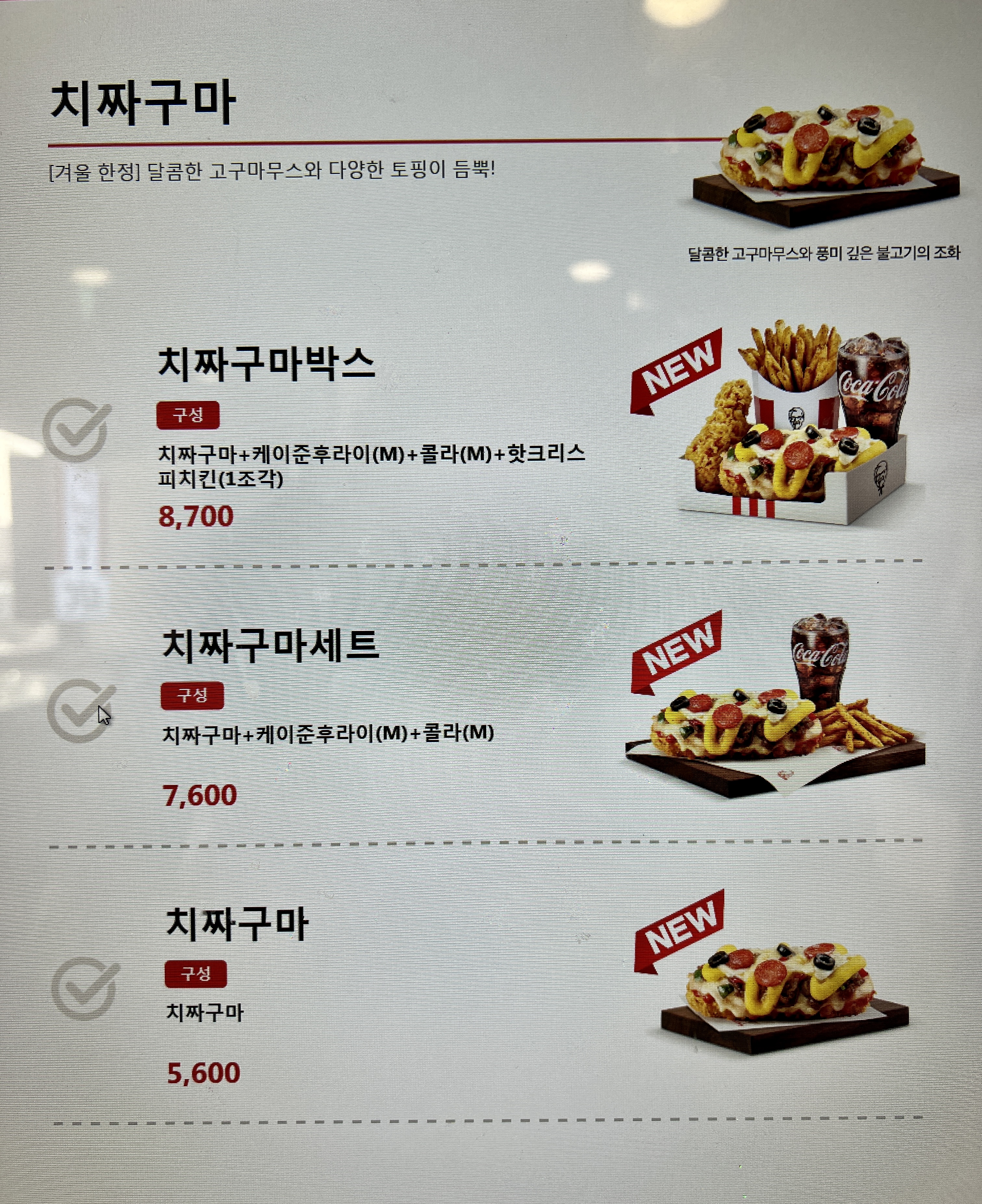간만에 간 KFC에서 제 눈을 사로 잡은 치짜구마라는 신메뉴가 눈에 띠어 시도해보게 되었습니다.
