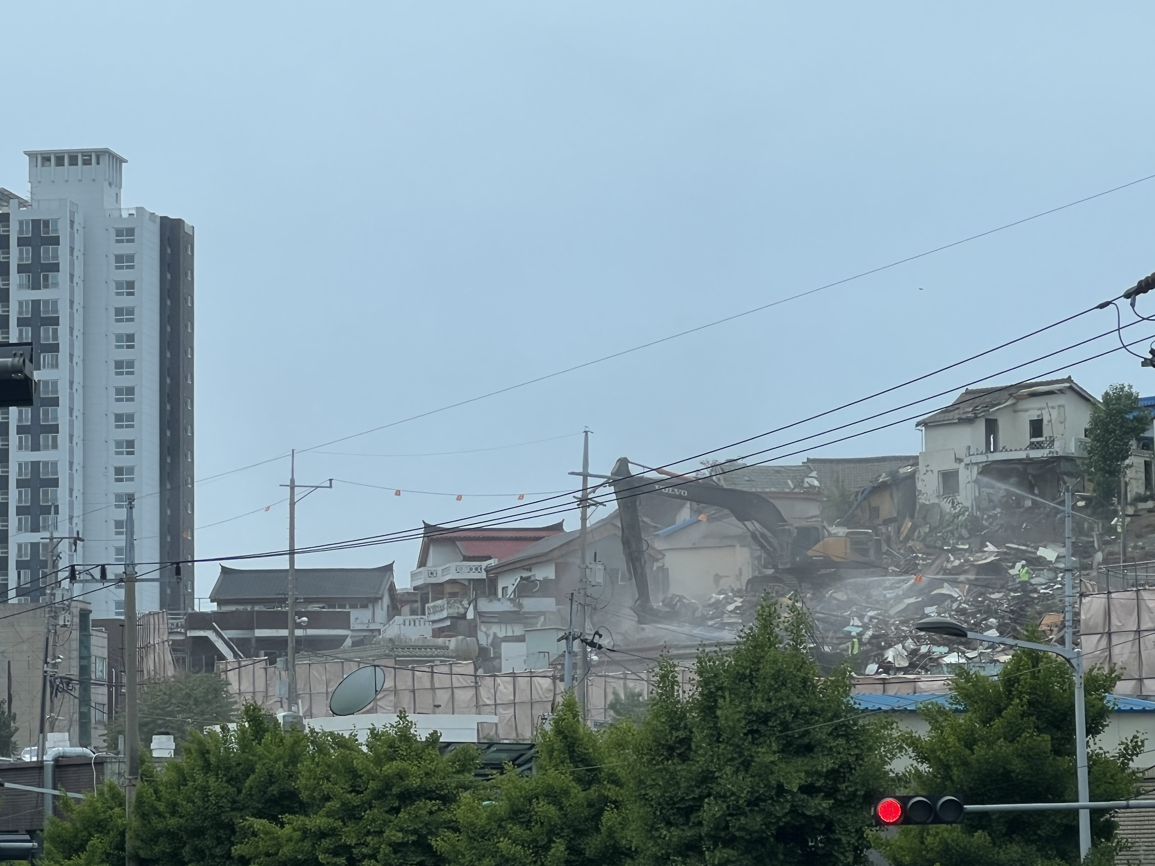 언덕길 위에 포크레인이 올라가서 열심히 물을뿌리며 철거가 한창 진행되는 모습입니다.