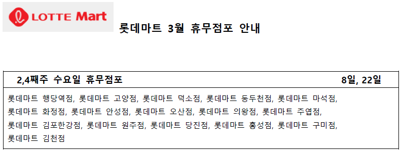 3월 롯데마트 휴무일 - 2,4째주 수요일