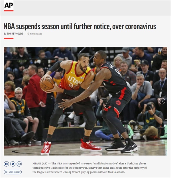 1. 코로나 19 선수가 코로나19 확진 판정... NBA, 리그 전격 중단