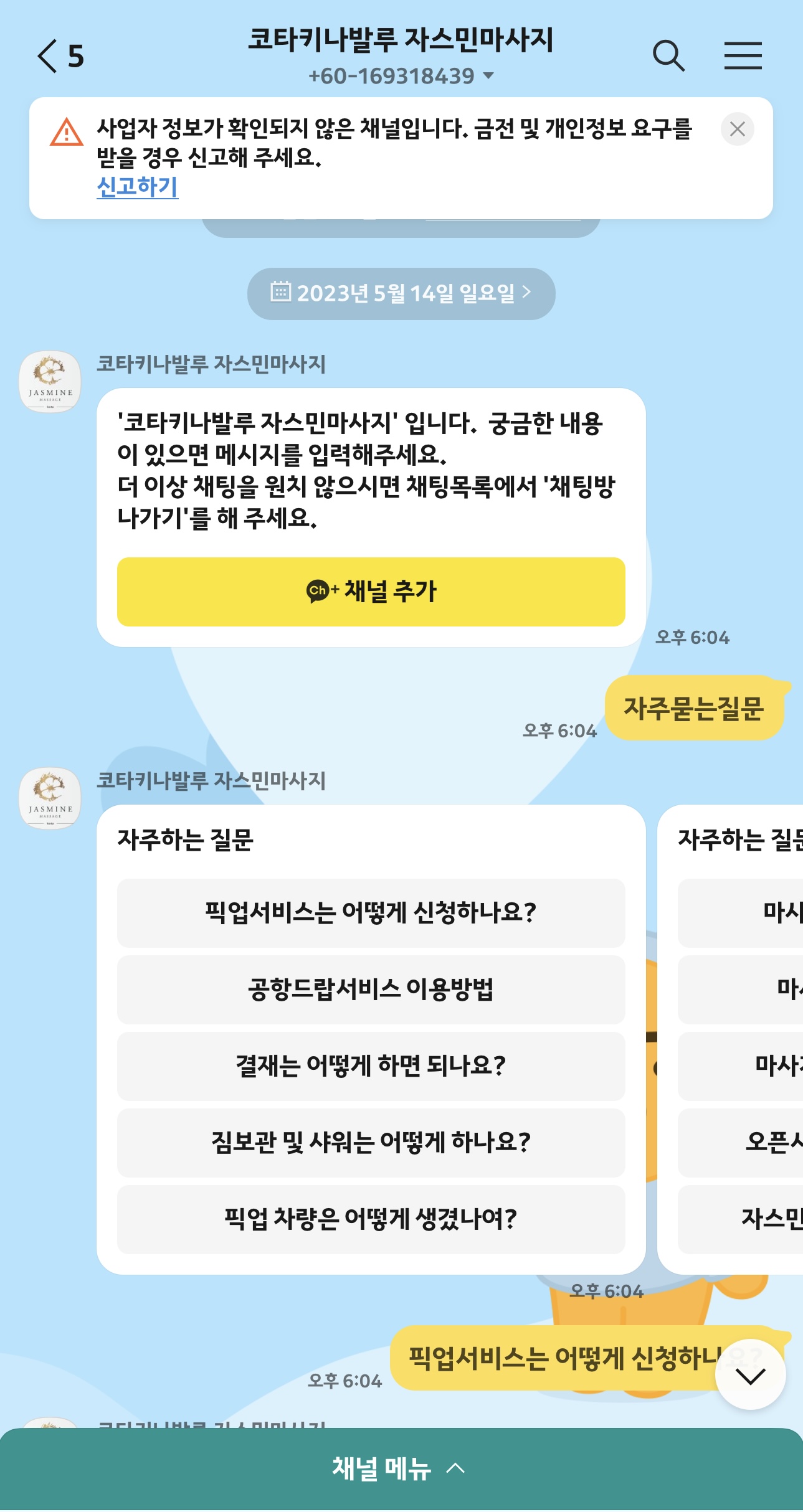 자스민 마사지 카카오 예약채널