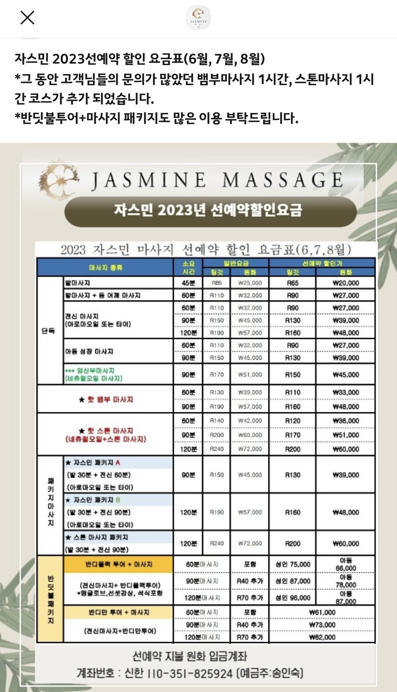 자스민 마사지 선예약할인요금