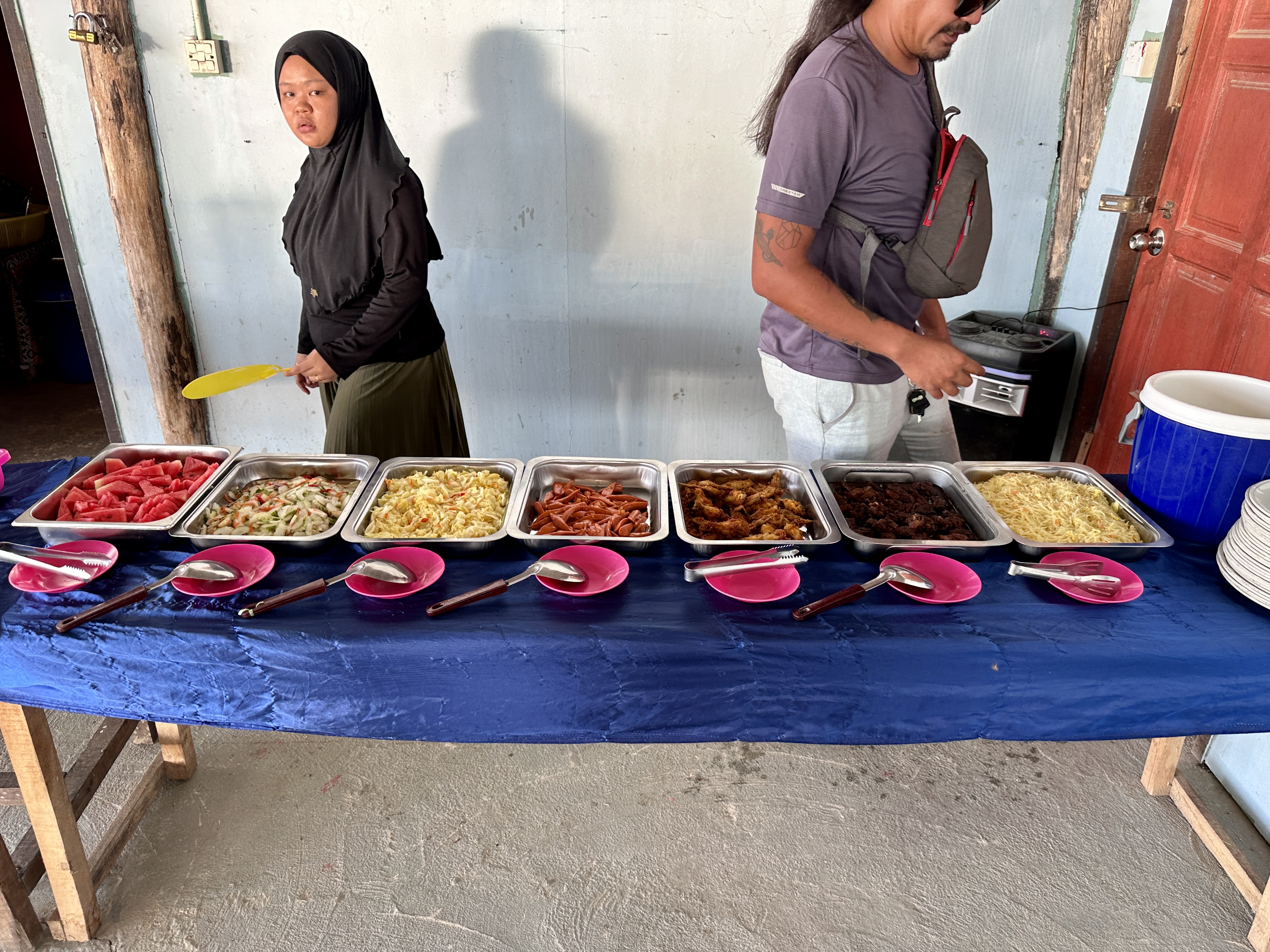 말레이시아 전통식에 닭 튀김과 각종 채소와 수박이 후식으로 준비되어 있었습니다.