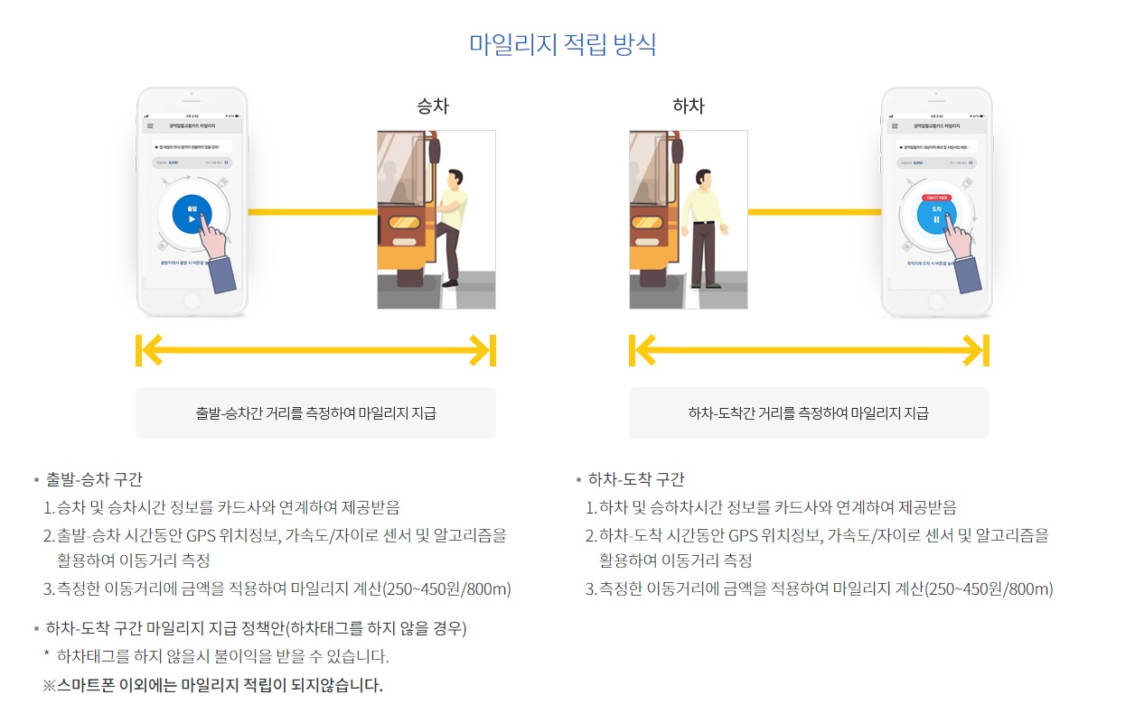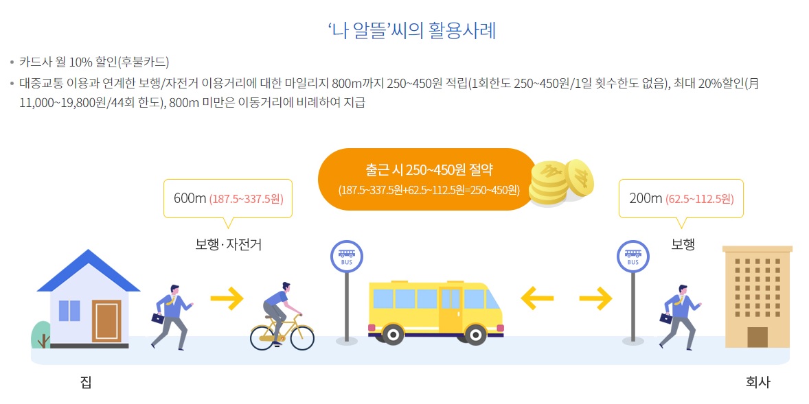 대중교통을 이용하기 위해 걷거나 자전거로 이동한 거리만큼 마일리지를 적립하여 지급하고,