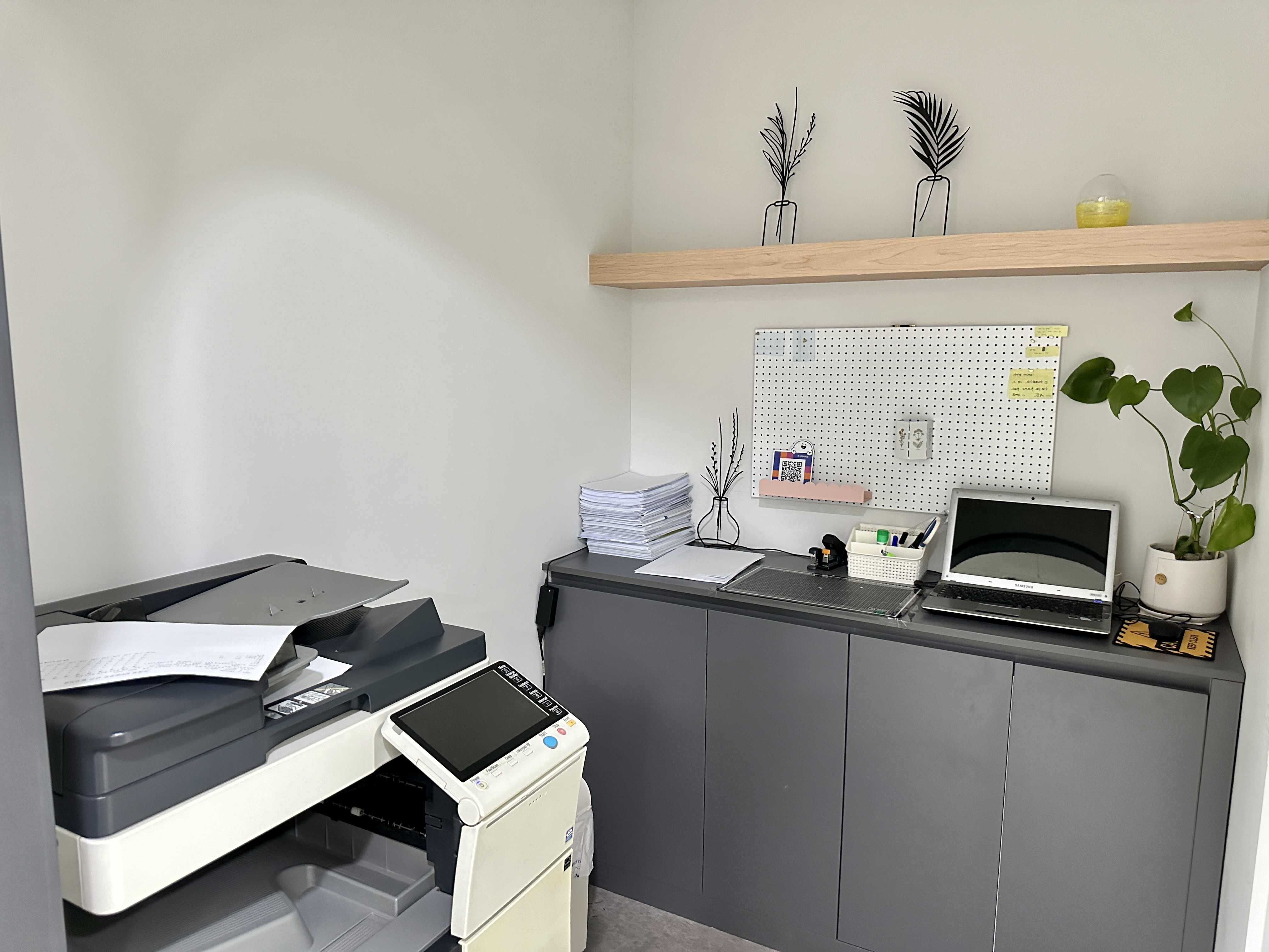 공유오피스 공간에는 냉장고와 커피머신이 있는 탕비실이 있고, 복사와 팩스를 보낼 수 있도록 복합기도 설치되어 있어서 업무하는데에 편리함을 제공하고 있었습니다.