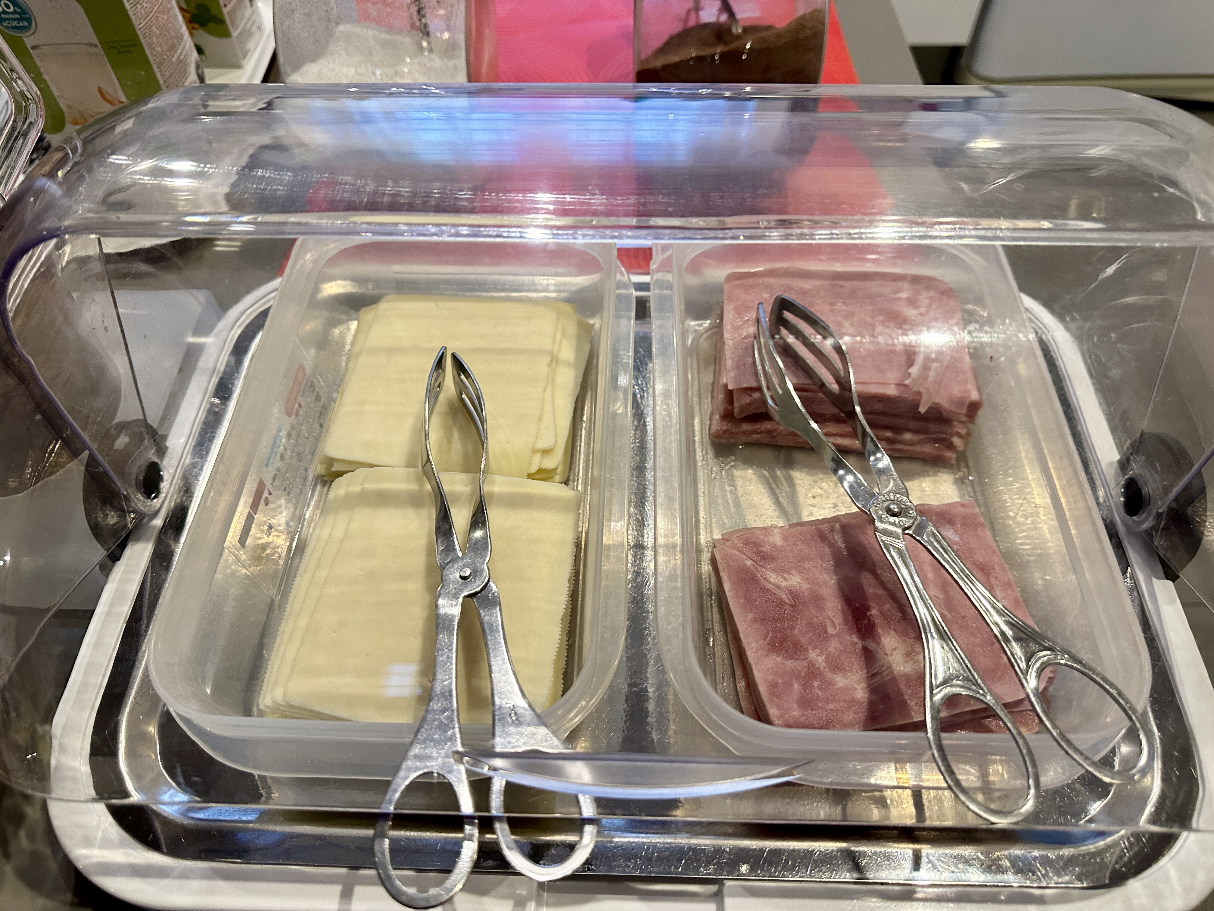 빵과 햄앤치즈에 시리얼이 있고, 각종 과일도 풍부하게 제공됩니다.