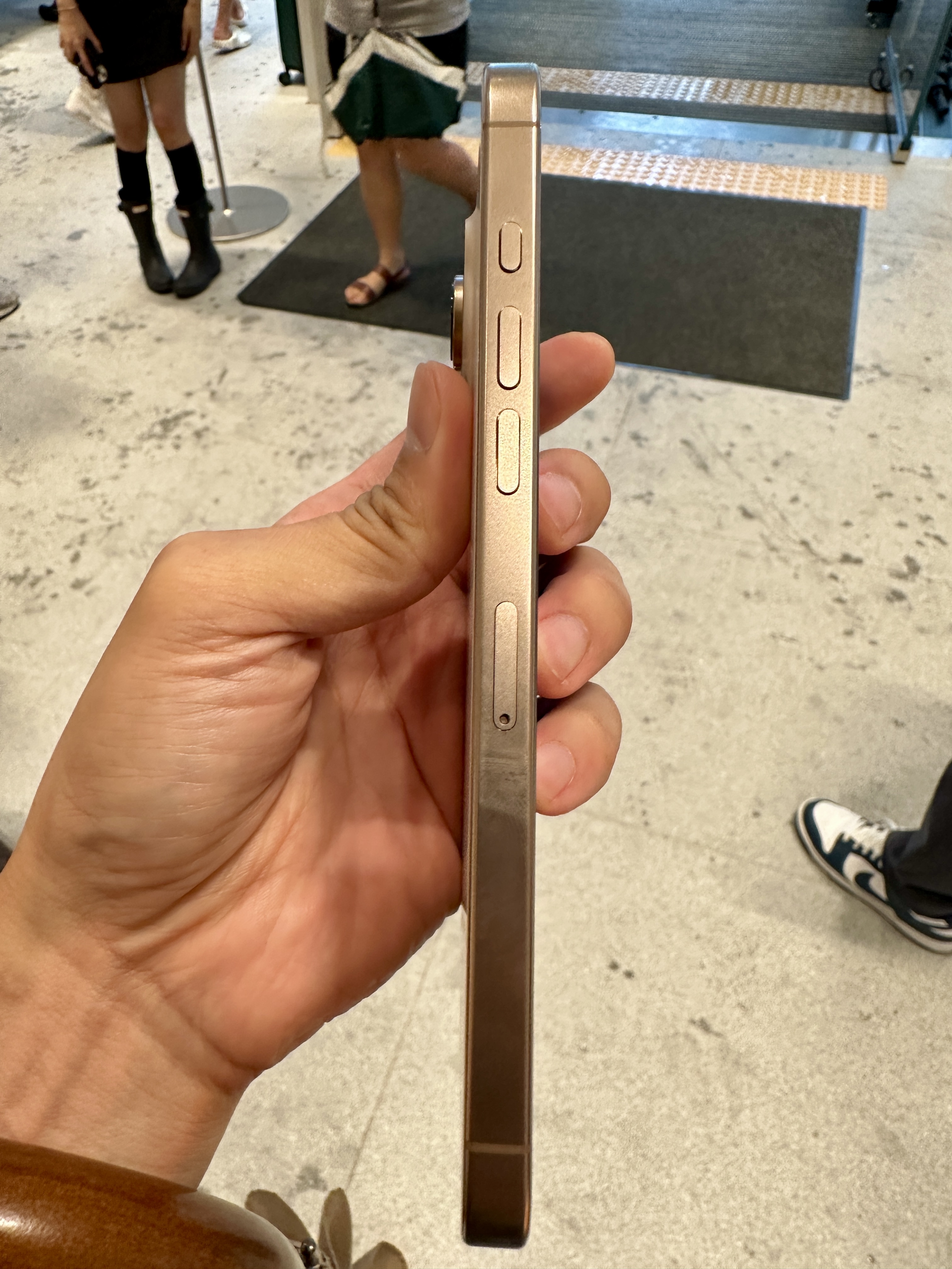 그 동안 실물을 구경해보라며 매장에 전시되어 있는 아이폰 16 프로맥스 데저트 색상을 주셔서 제 기계를 받기 전에 실물을 먼저 감상하고 있었는데, 예전 아이폰 6~8 시리즈때의 로즈골드 느낌이 나지만 약간 덜 화사한 살구색 느낌이 나는 데저트 색상이었습니다.