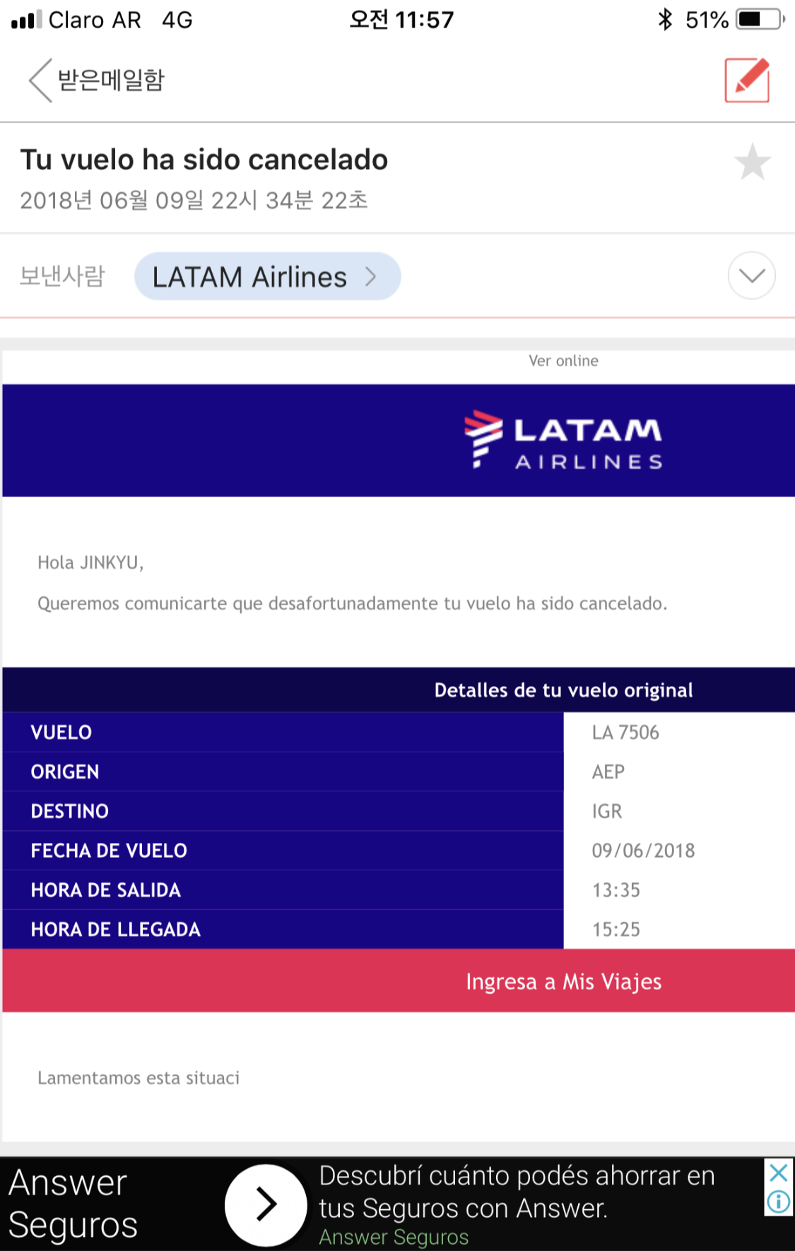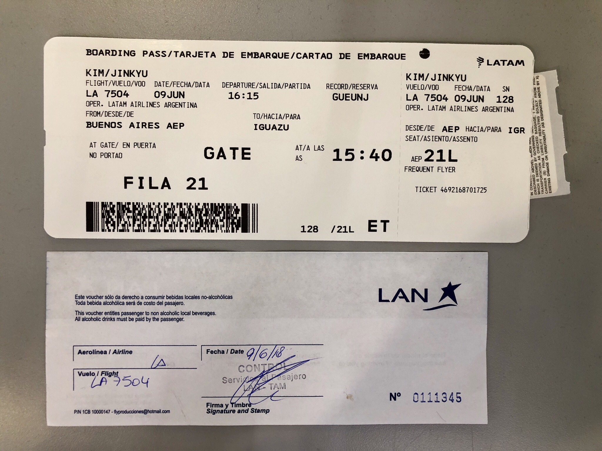 바뀐 비행편은 LA7504 AEP 16:15 -> IGR 18:05 으로 푸에르토 이구아수 까지 약 110분 정도 소요되었다.