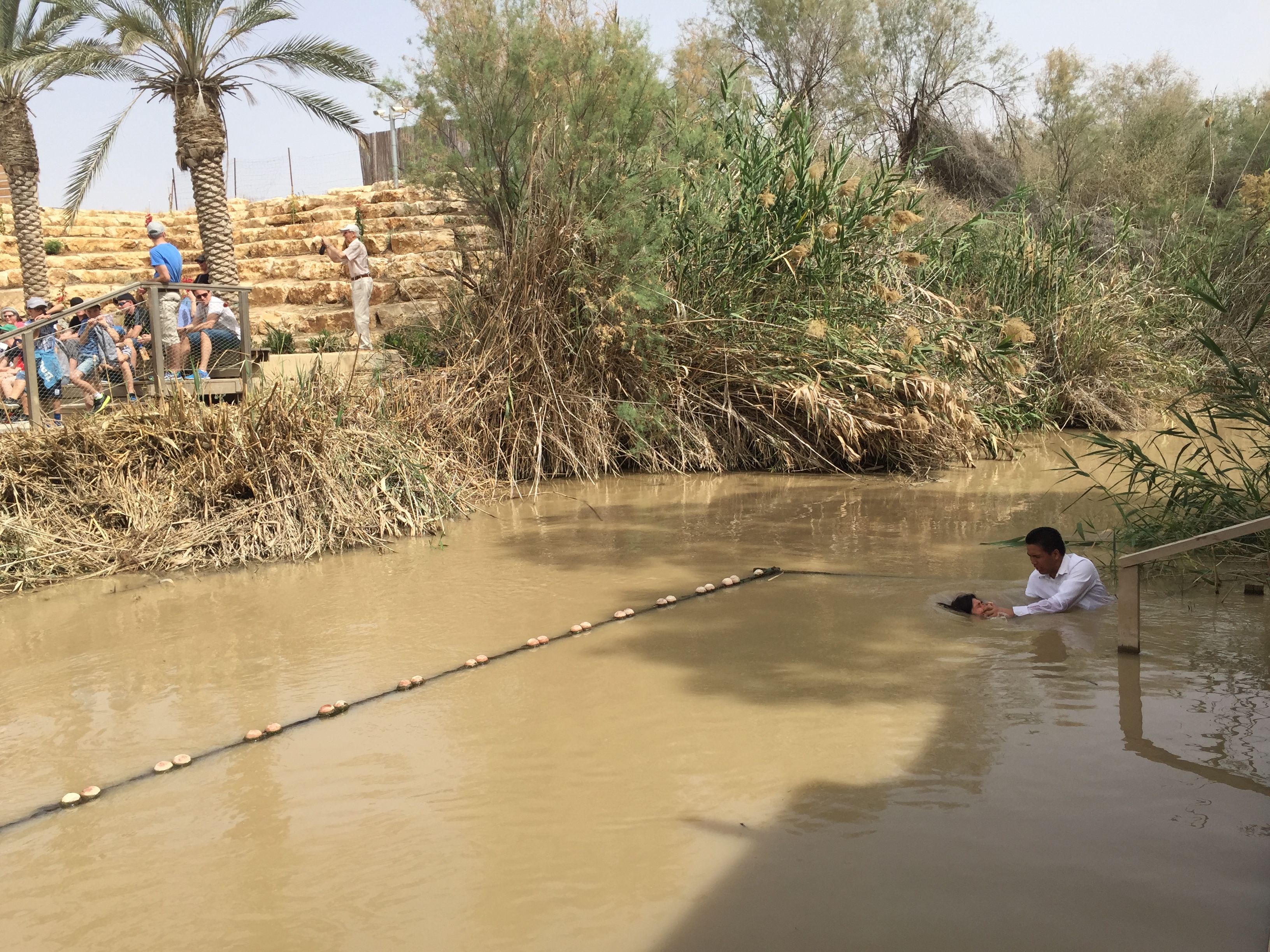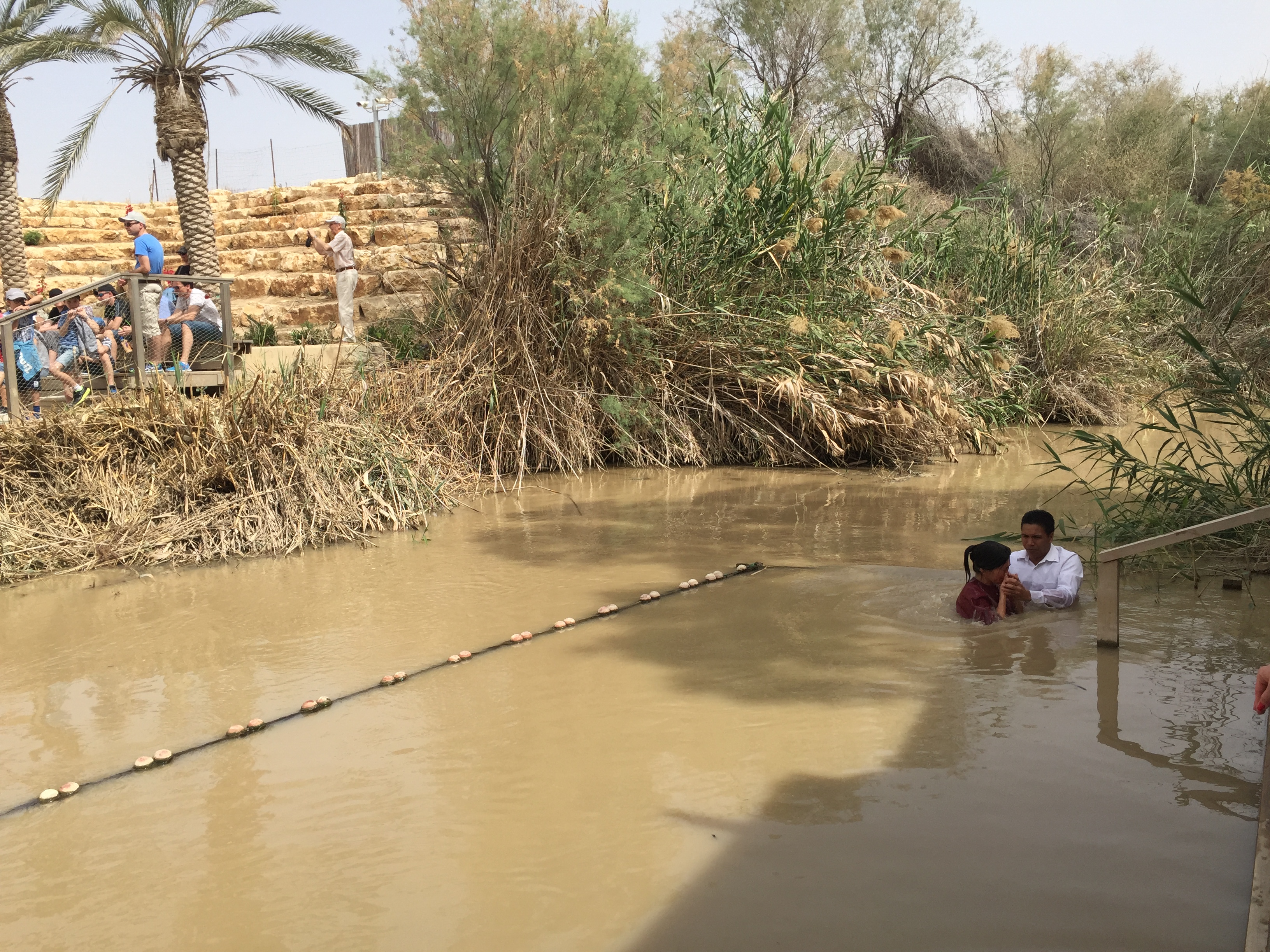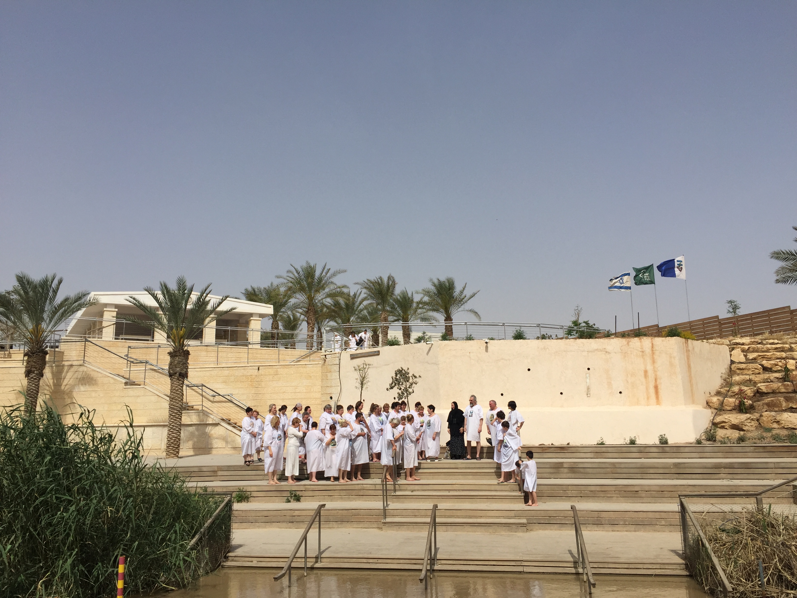 강 건너편 이스라엘에는 침례교방식의 물에 완전히 잠기는 세례법에 따라 모두 흰 가운을 입고