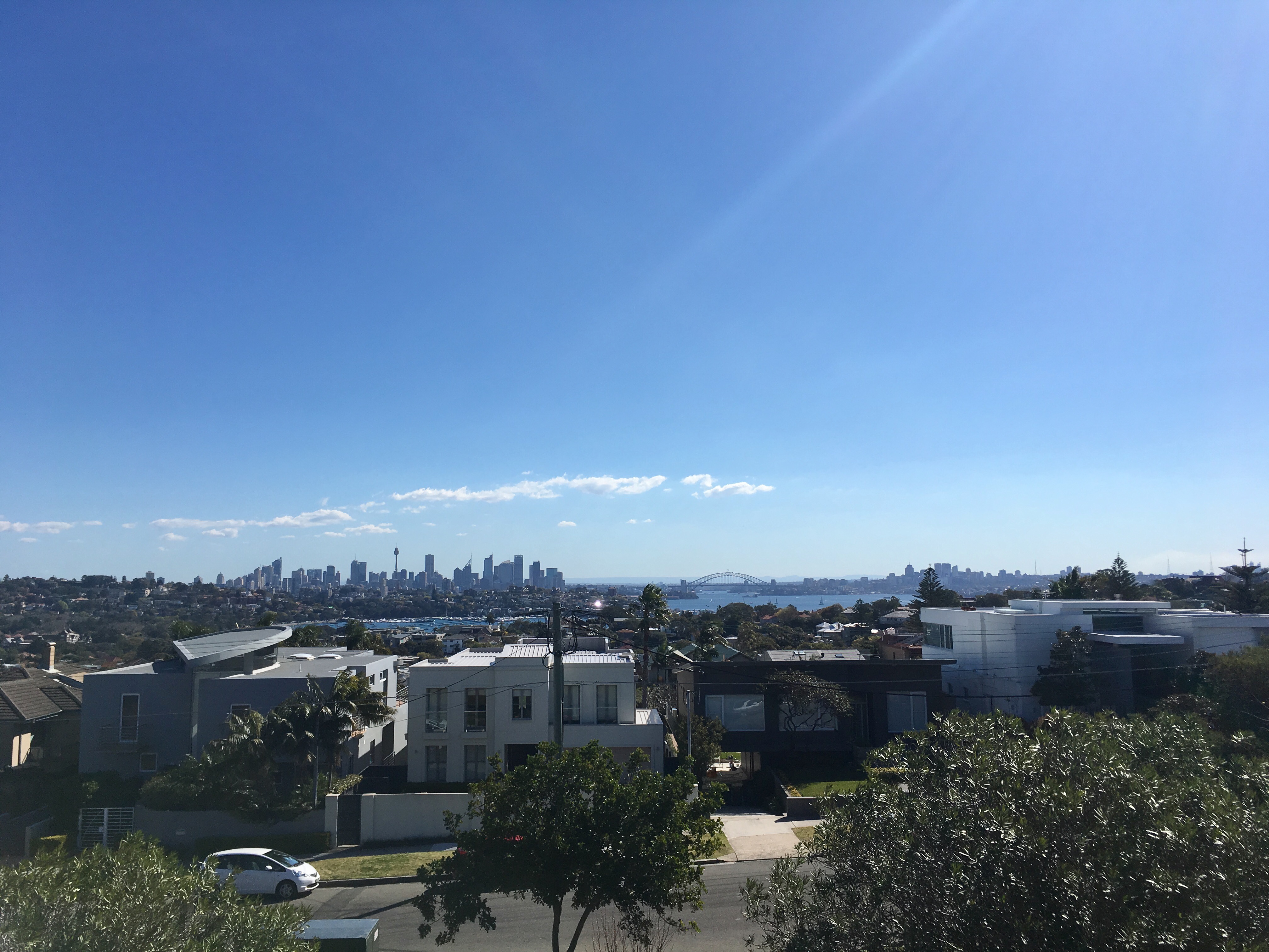 더들리 페이지에서 바라보는 시드니 시티는 푸른빛의 바다와 하늘, 멀리 보이는 하버 브리지, 오페라 하우스,