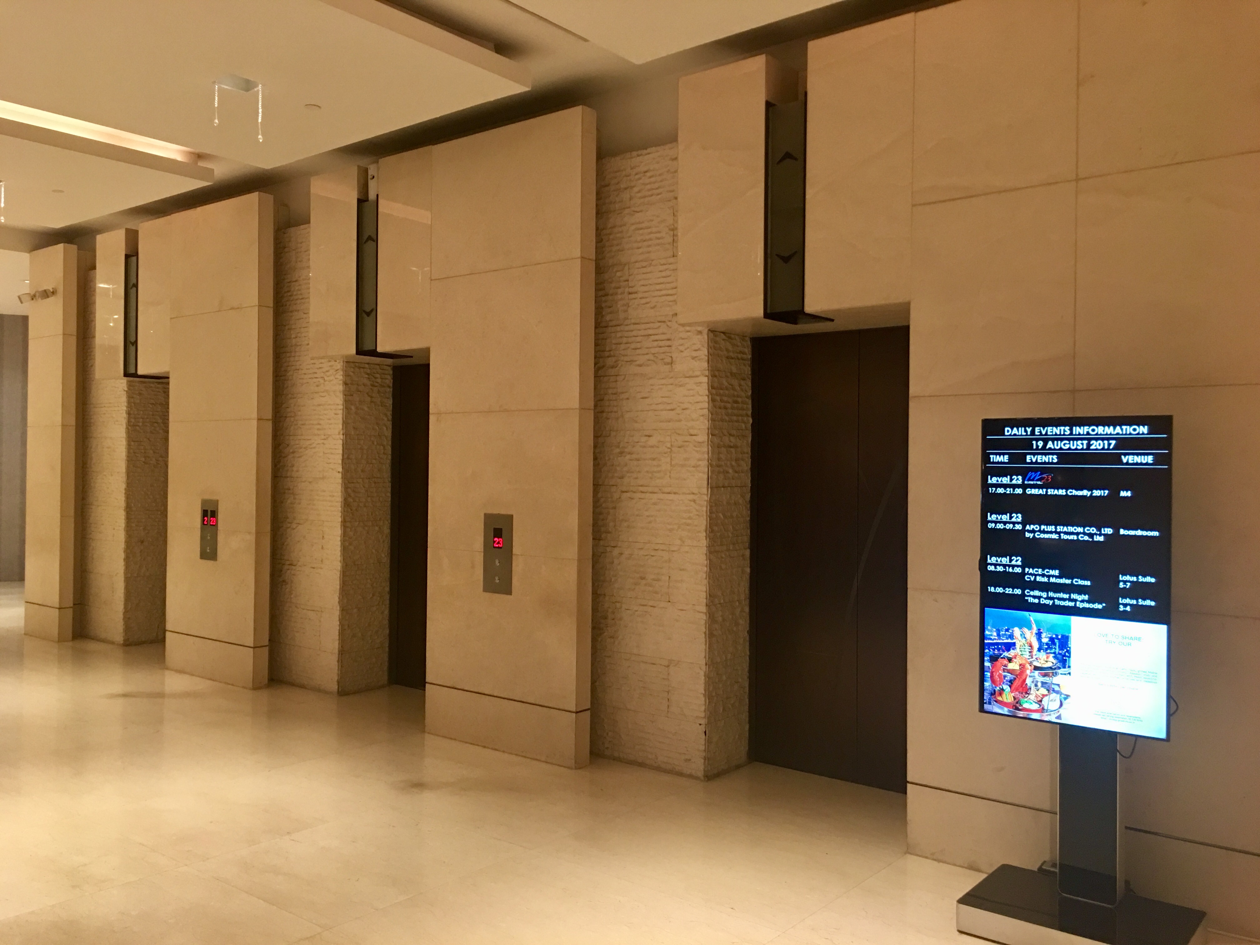 로비에서 엘리베이터를 타고 23층에 내려서 엘리베이터를 바꿔 타면 내가 가려고 하는