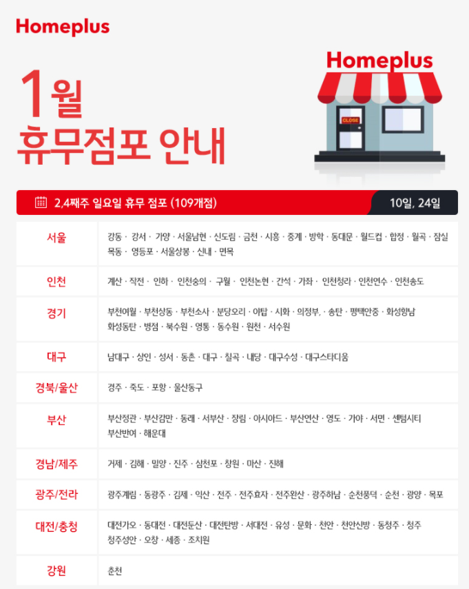 두번째로 2,4째주 수요일인 1월 13일과 27일에도 22개의 홈플러스점포가 휴무하게 됩니다.