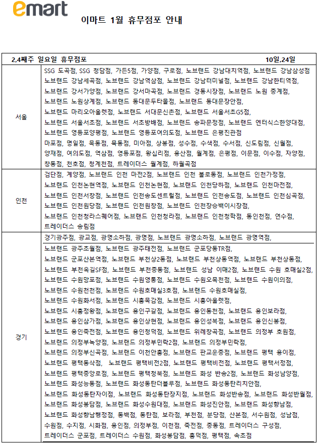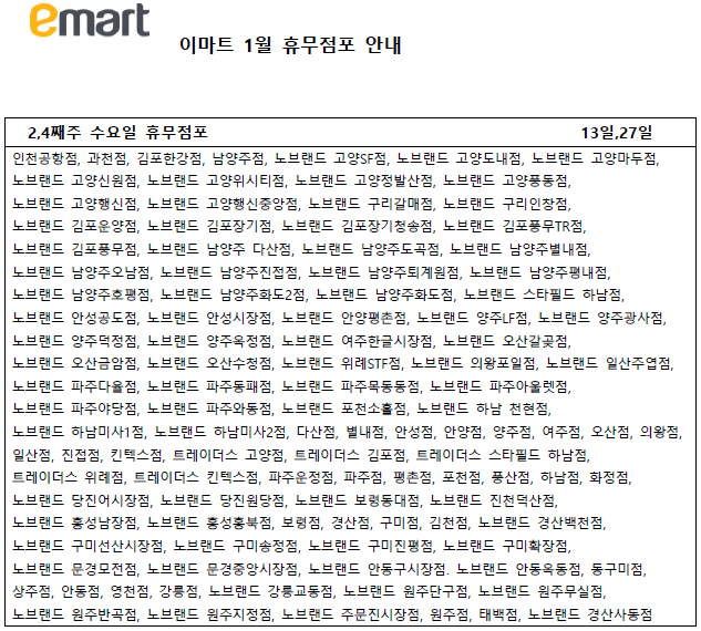 마지막으로 1월 이마트 기타요일 휴무 점포들입니다.