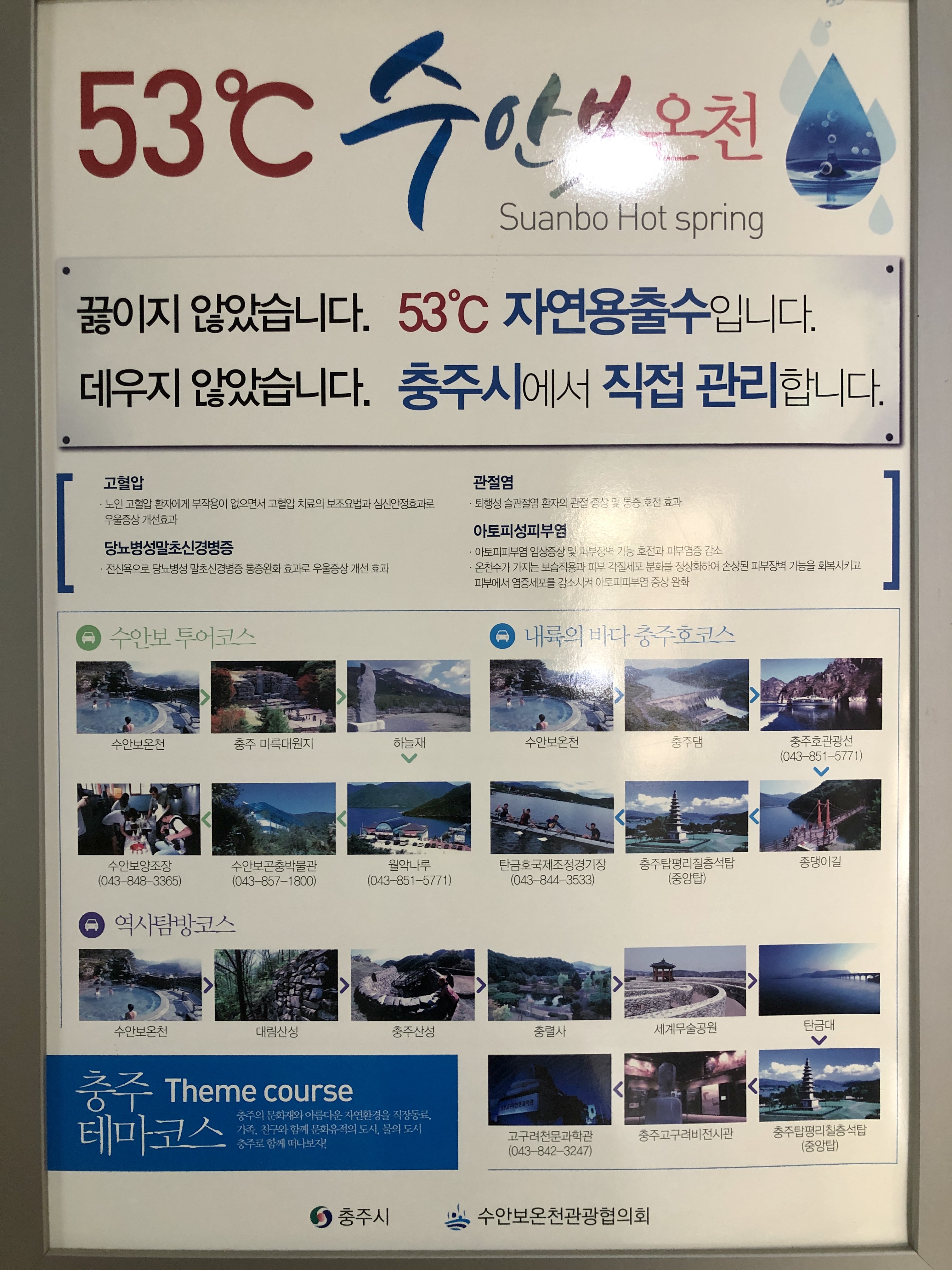 수안보 온천은 53도씨의 자연용출수로 데우지 않은 온천수이며 충주시에서 직접관리 한다고 합니다.