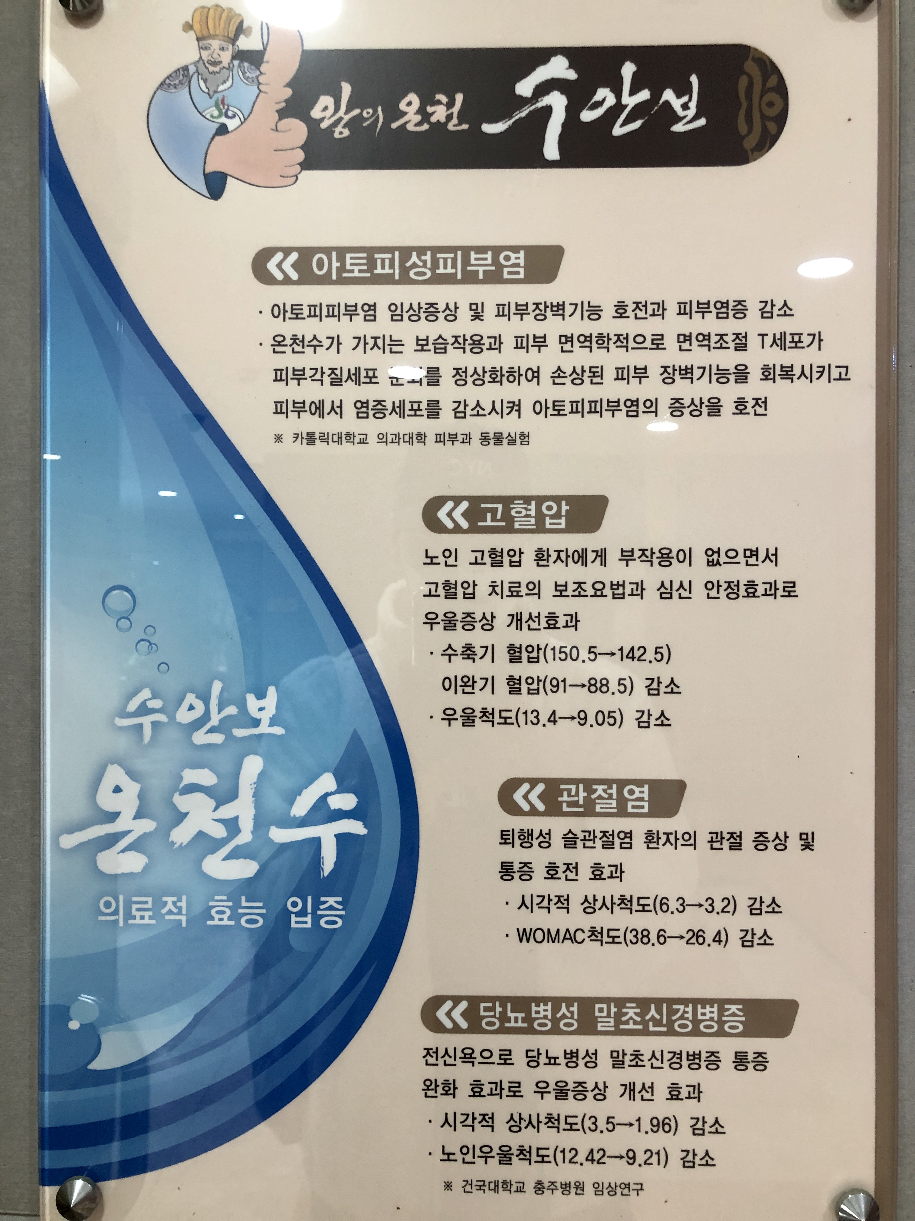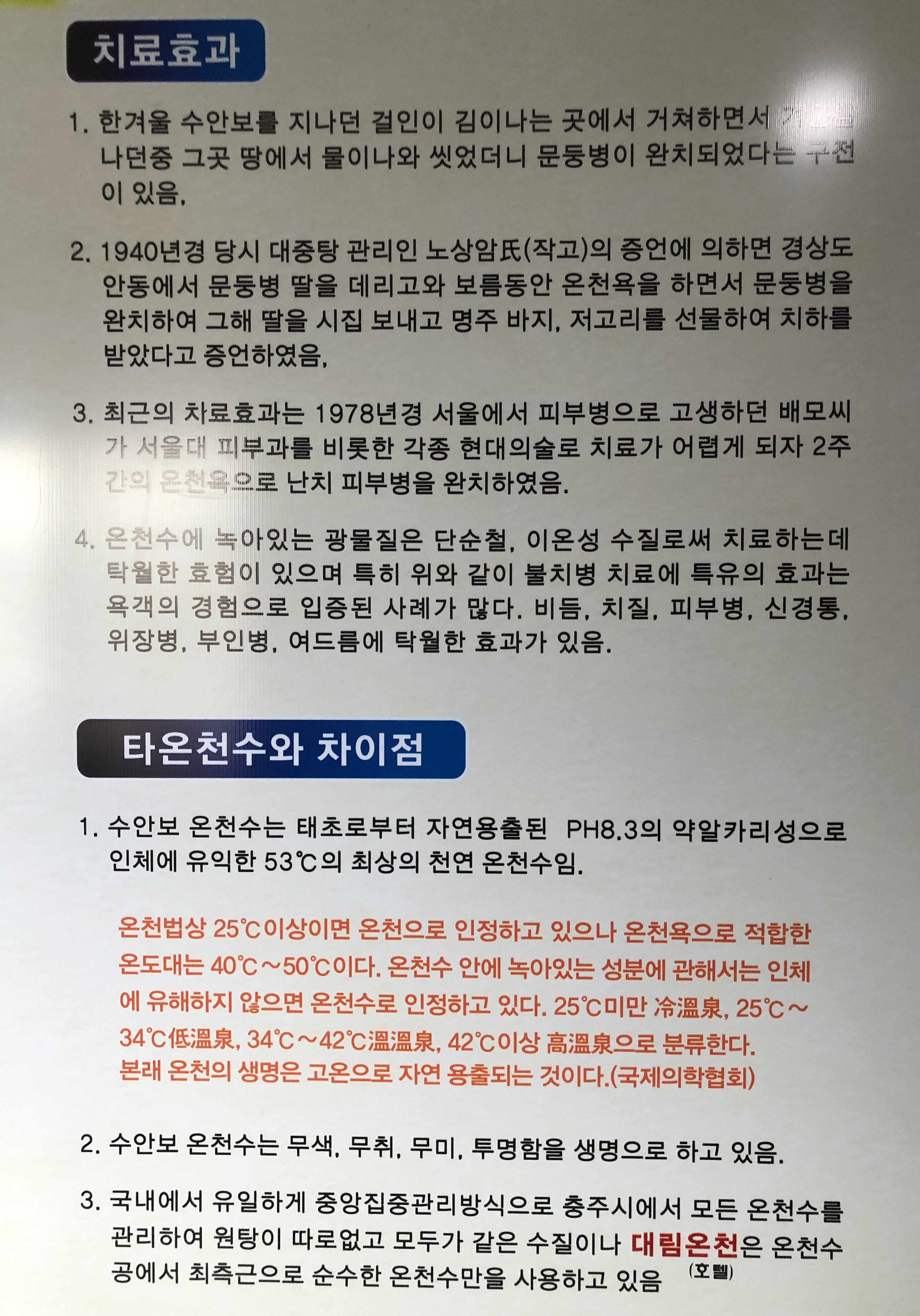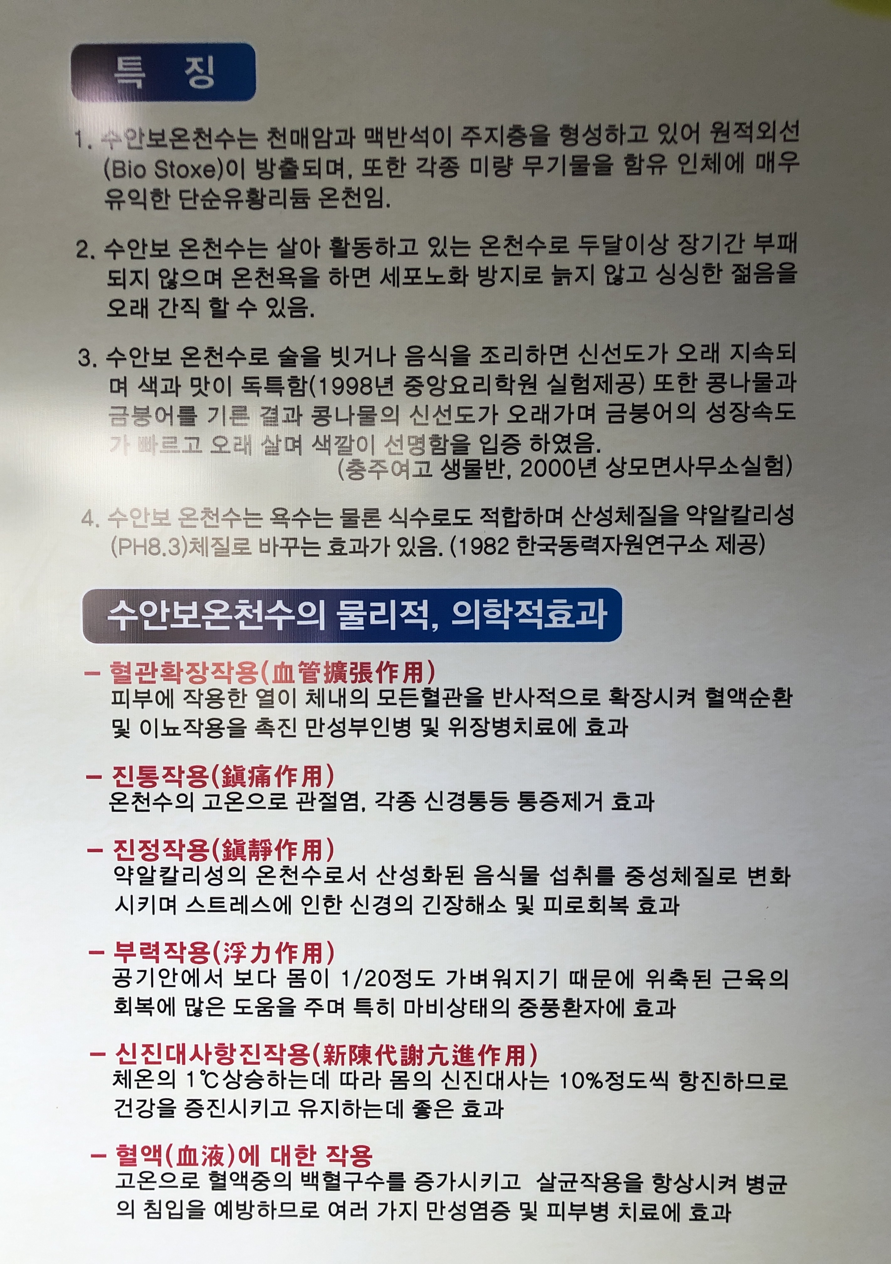 수안보온천수의 물리적, 의학적효과와 특징에는 굉장히 좋은 점들이 많았는데 특히