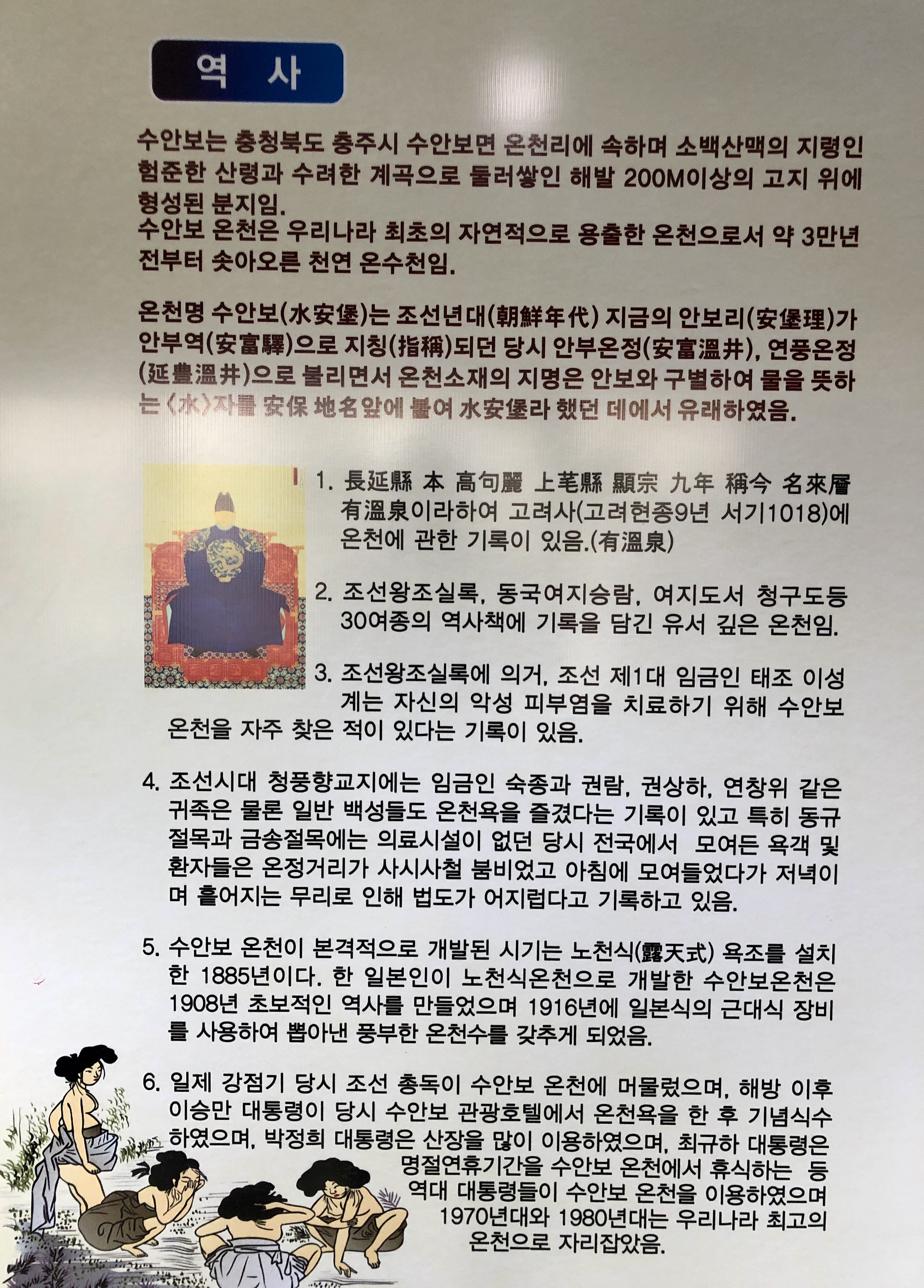 조선의 1대 임금인 태조 이성계가 자신의 악성 피부염을 치료하기 위해 수안보 온천을 자주 찾았다고 하여