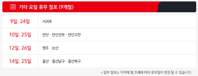 마지막으로 4월 9일과 4월 24일 휴무 점포는 서귀포 홈플러스입니다.