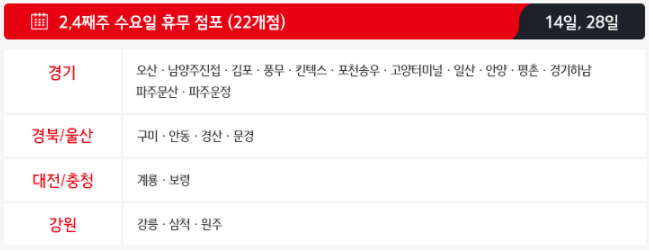 두번째로 2,4째주 수요일인 4월 14일과 28일에도 22개의 홈플러스점포가 휴무하게 됩니다.