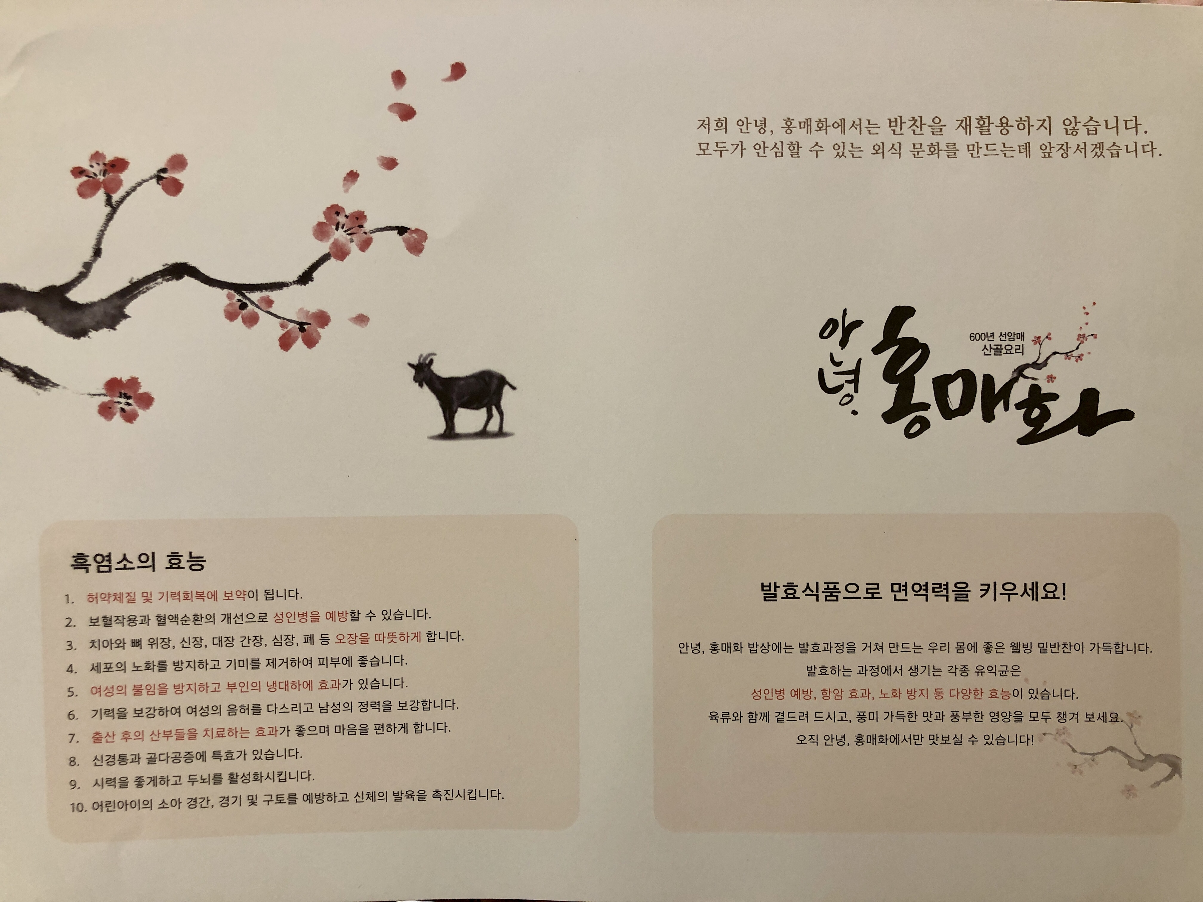 여수 한정식 맛집 안녕홍매화의 대표메뉴격인 흑염소 떡갈비를 주문하니 흑염소의 효능이 나와있더라구요