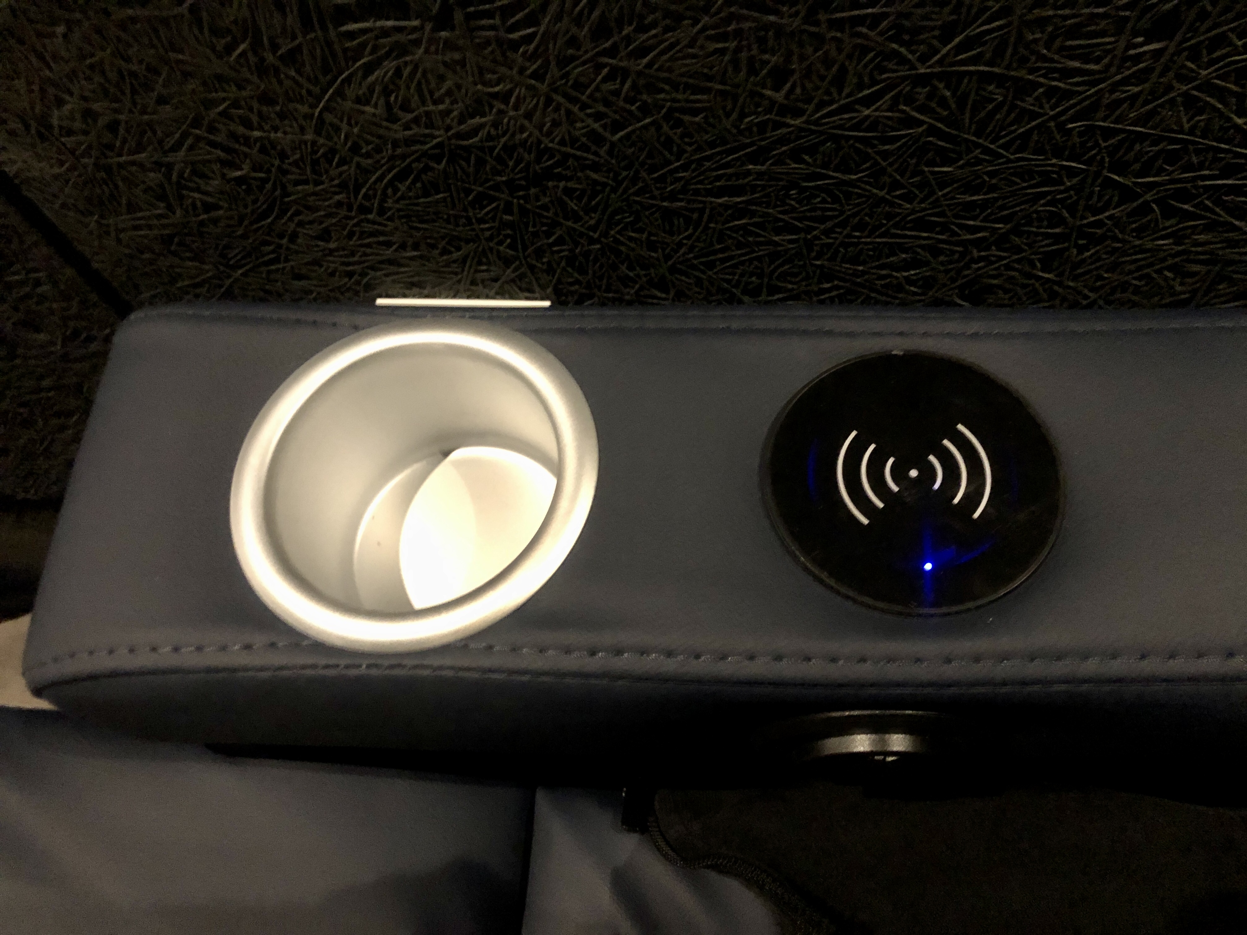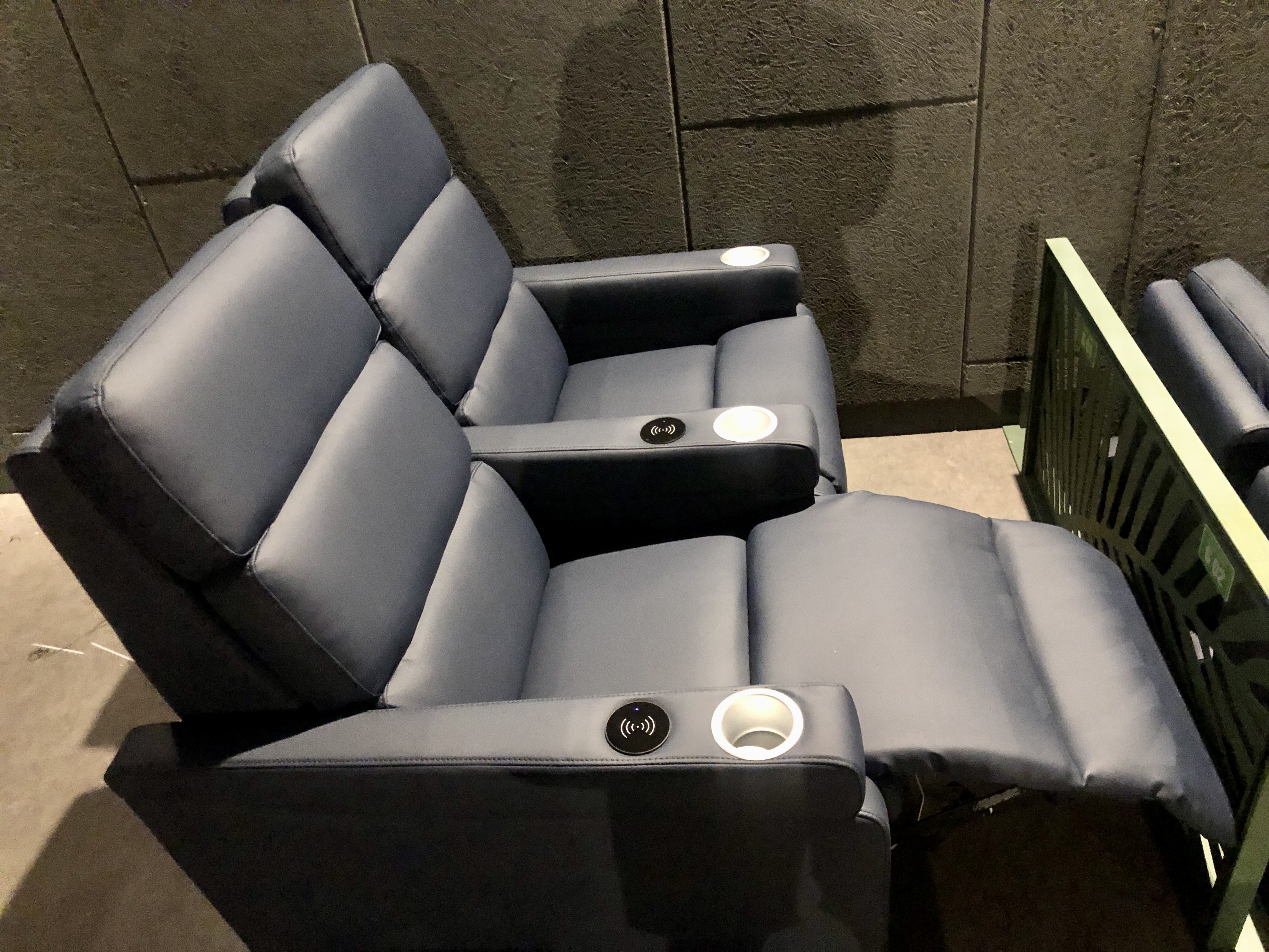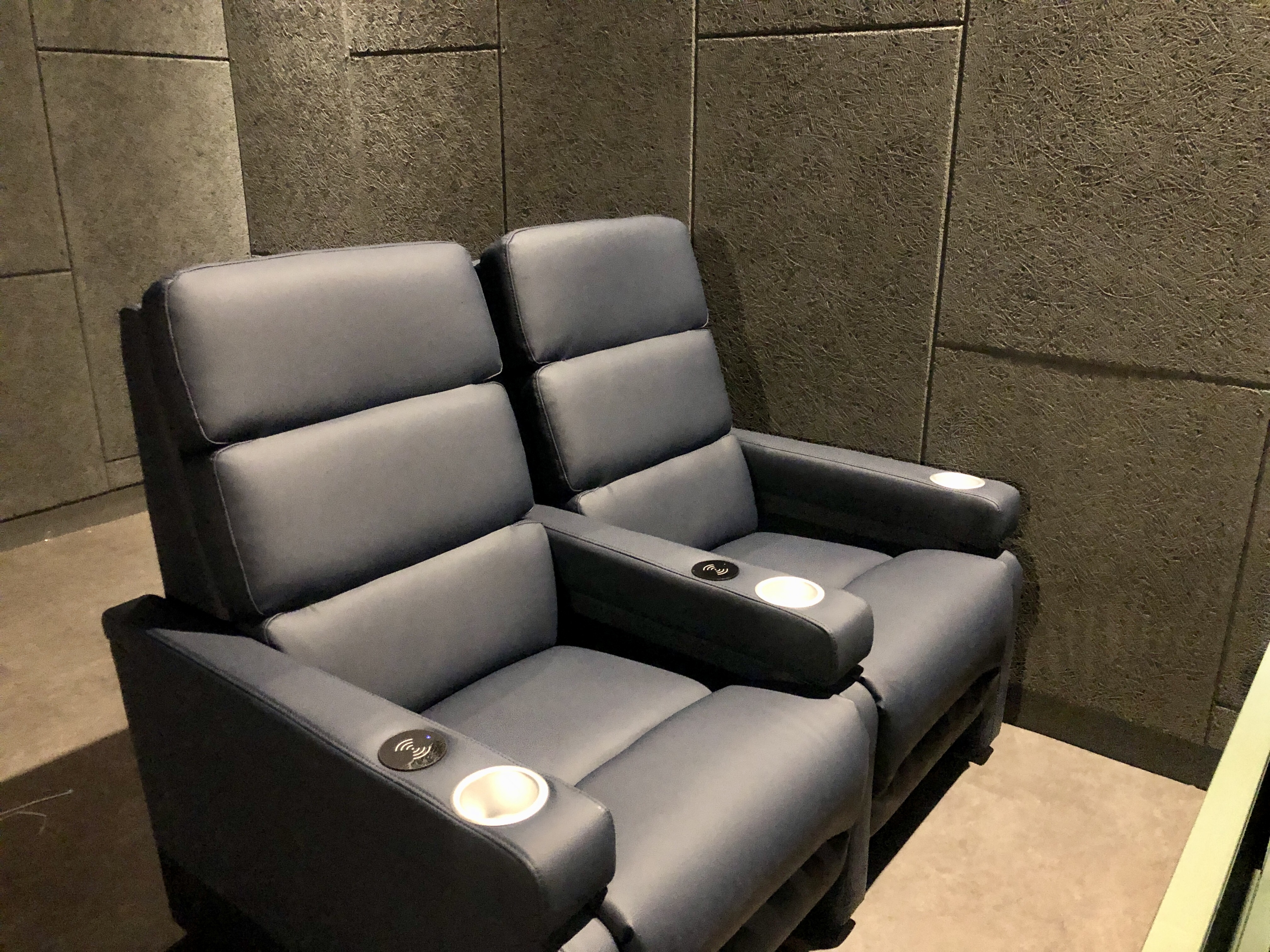 게다가 좌석 옆에 컵 홀더 부분에 무선충전까지 되서 영화보면서 휴대폰 충전까지 가능합니다.